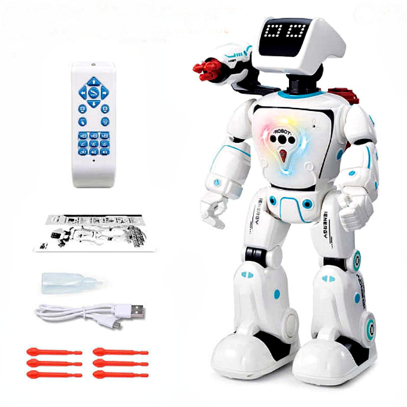 Інтерактивний робот новинка у світі роботів!! Він стріляє та заправляється водою, реагує на жести.Найочікувана новинка та мрія кожного хлопчика.Робот має безліч функцій, на його стопах розміщені по 4 коліщатка, що дає змогу виконувати йому рухи в різних площинах, будь-якій складності. У нього чудово опрацьовані всі суглоби, тож його рухи максимально реалістичні. Також світяться очі — що вельми цікаво під час гри в темному приміщенні.